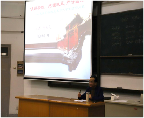 步珏良副教授简要介绍了高校宗教工作的重要性,强调同学们应正视并尊重宗教文化差异,引导同学们以辩证的心态看待宗教现象。随后,步珏良副教授向同学们详细讲解了我国的宗教政策,剖析了邪教的六个基本特征,并指出要正确区分宗教与邪教、宗教与封建迷信,坚决反对和抵制邪教。