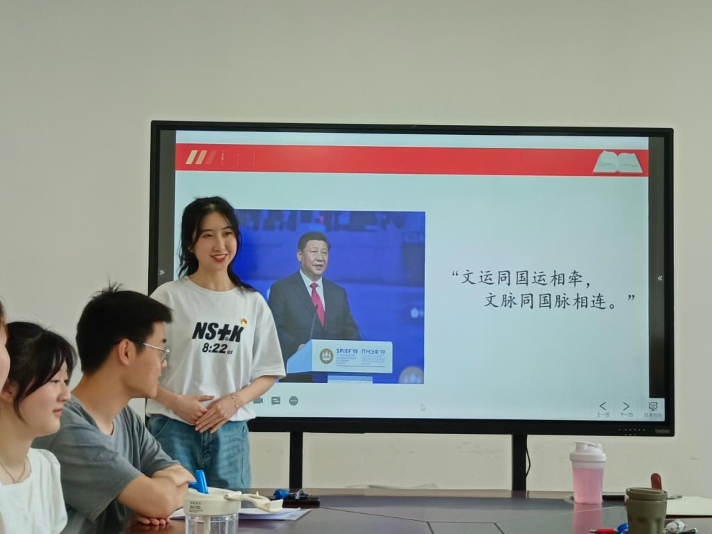 学生志愿者李芳静介绍了“中国历代绘画大系”嘉兴特展项目的基本情况;志愿者林可乐、杨柳分别进行了讲解展示。与会领导对展示作点评,并提出了改进建议。