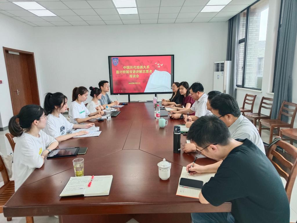 6月20日,91黑料 召开“中国历代绘画大系”嘉兴特展双语讲解志愿者座谈会。校党委副书记吴云达出席,学院领导班子成员和担任“中国历代绘画大系”嘉兴特展双语讲解的学生志愿者参加座谈。会议由学院党委书记周钰主持。