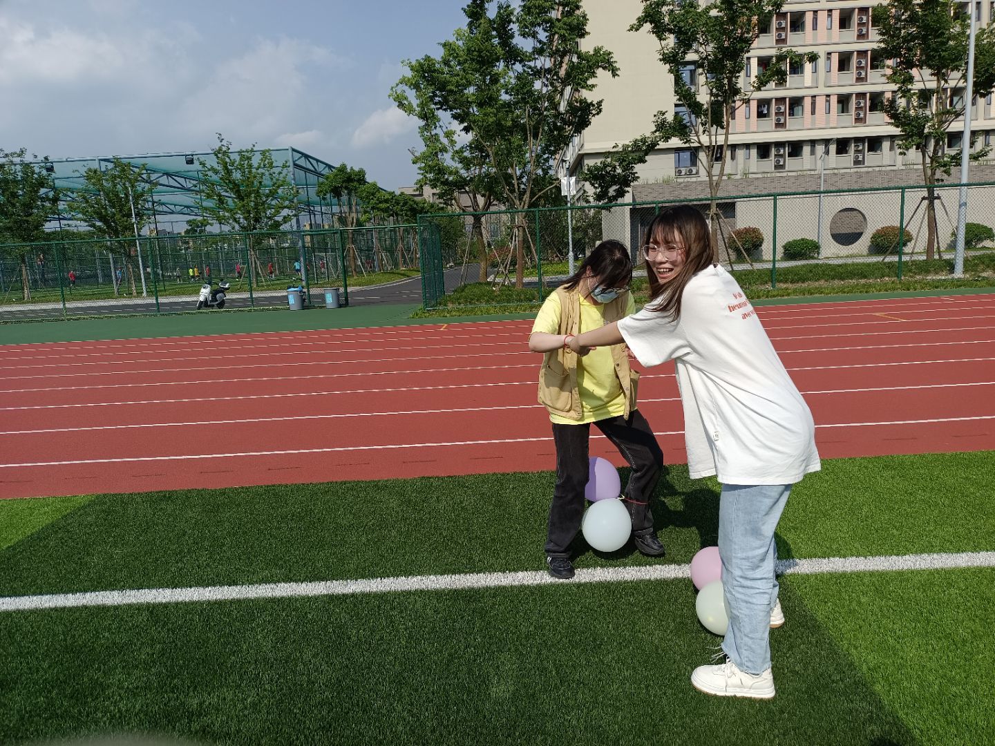 本次活动共分为三个部分:首先是预热的集体游戏“飞机头”,活动目的是通过同学之间的互相配合,使他们感受人与人之间的互相信任,同时也激发同学们的游戏兴趣和激情。第一部分结束后,现场的同学们很快摆脱了紧张的情绪,进入了游戏状态。到了“气球爆破”游戏环节,每位同学首先需要在他人的帮助下将两个气球绑在腿上,游戏开始后,同学们以挤破对方腿上的气球数量多者获胜。在一声声清脆的气球爆破声中,同学们的兴致达到了高潮。最后进行的是“你我的歌”小游戏,该游戏先将同学分为三组,每人分别唱出自己纸条上的歌曲来寻找和自己同组的小伙伴。