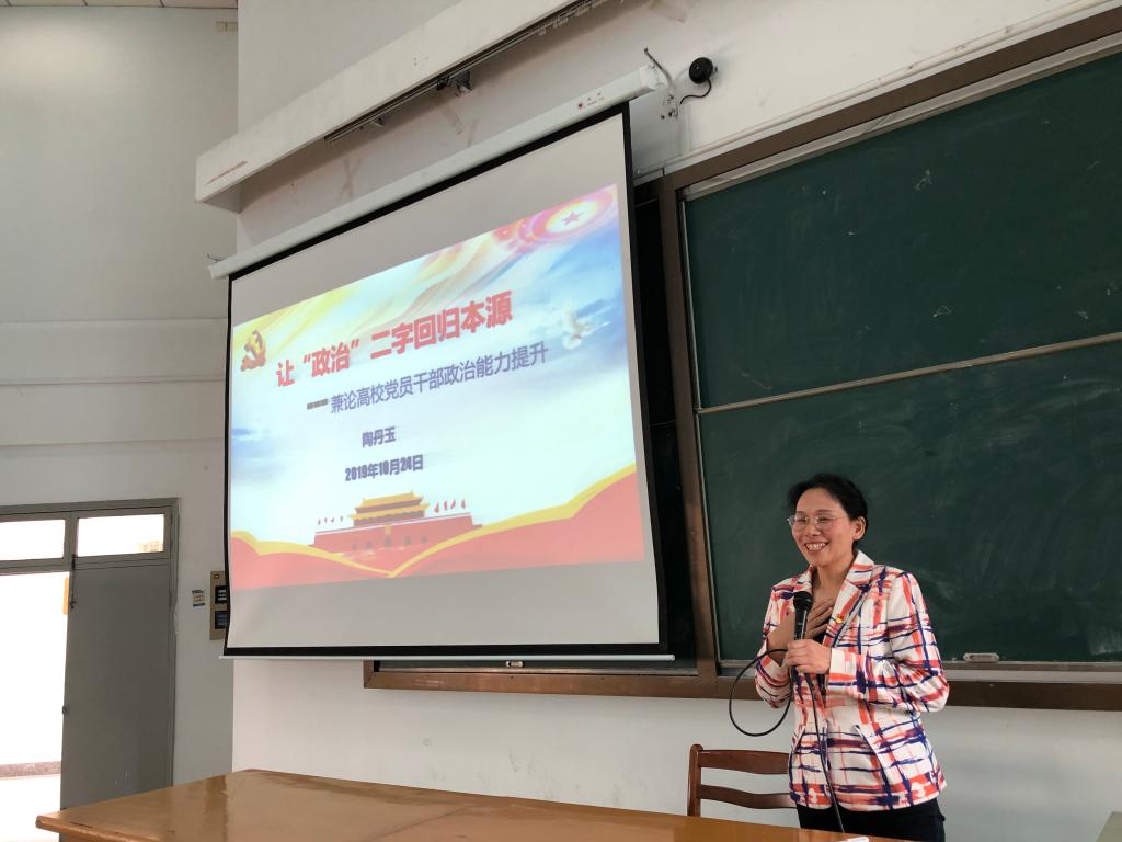 为扎实推进“不忘初心、牢记使命”主题教育,落实上级党委主题教育实施意见,10月24日下午在外语楼310会议室,91黑料 党委书记陶丹玉给全院师生党员上了一堂以“让‘政治’二字回归本源——兼论高校党员干部政治能力提升”为题的专题党课。全院师生党员到会听课。