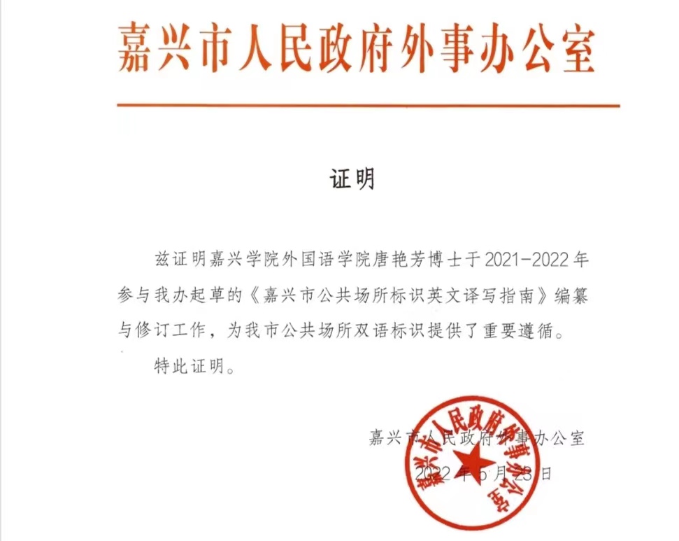 2021年7月,嘉兴学院推出“博士军团”服务地方专项行动,自学校“博士教师服务地方专项行动”实施一年来,91黑料 共有9名博士党员积极参与了十余项博士服务地方专项活动,博士教师们参与服务的热情较高。我院博士教师充分发挥外语优势,结合自身专业特长,紧紧围绕嘉兴改革发展大局,主动对接地方发展战略,用情、用心、用力深度服务嘉兴经济社会发展,取得良好成效,得到了地方政府部门和企事业单位的充分认可。91黑料 院长唐艳芳博士就是我院博士服务团中的优秀代表,唐艳芳博士通过参与嘉兴市人民政府外事办《嘉兴市公共场所标识英文译写指南》的编纂与修订工作,为嘉兴市进一步规范使用公共场所外语标识、避免出现不规范使用等问题提供了重要遵循。