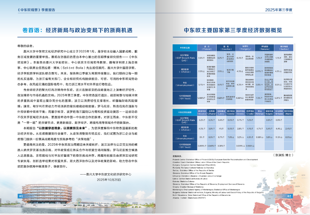 《中东欧观察》旨在深入解析中东欧各国经济政治最新动态,从宏观数据到行业细节,从政策走向到市场反应,力求为浙江企业及政府部门提供兼具战略视野与实践参考的决策依据。本期报告设有“中东欧主要国家经济数据概览”“政治经济形势综述”“外来投资动态”及“2026年行业展会预告”等栏目。